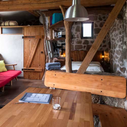 Le salon avec la cuisine américaine est spacieuse et grâce à l'intégration d'un rocher d'un caractère très particulier. Dans la chambre il y a un grand lit double (160) et une couchette en mezzanine disponible. Des lits supplémentaires sont possibles dans une tente. La salle de bain a son charme particulier grace aux pierres naturelles intégrées. Une grande terrasse vous invite à manger en plein air.